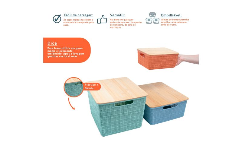 empilhável: além de ser charmosa, a tampa de bambu permite empilhar uma caixa em cima da outra, otimizando os espaços e deixando tudo bem organizado.