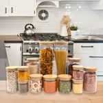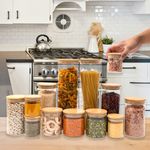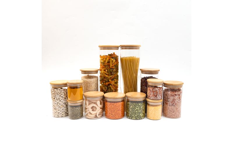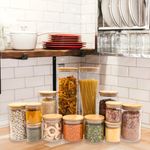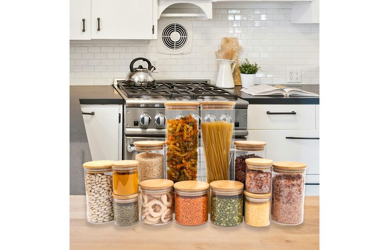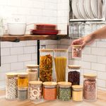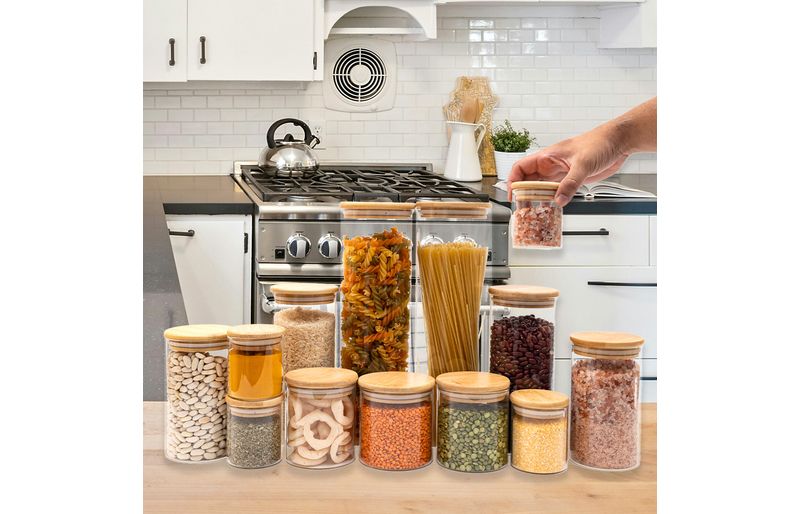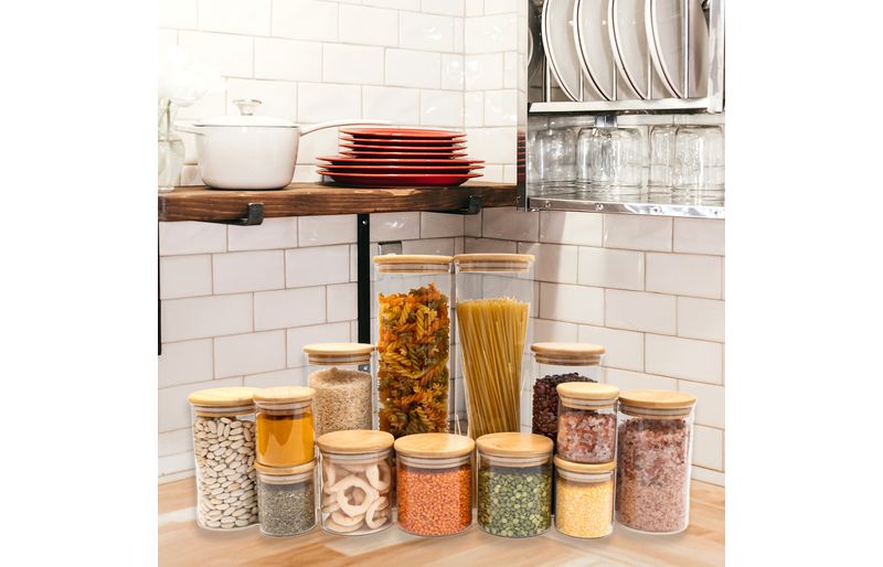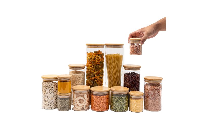 "conheça o kit de 13 potes de vidro herméticos com tampa de bambu de 200ml, 400ml, 600ml, 800ml e 2l da oikos!