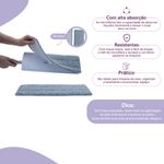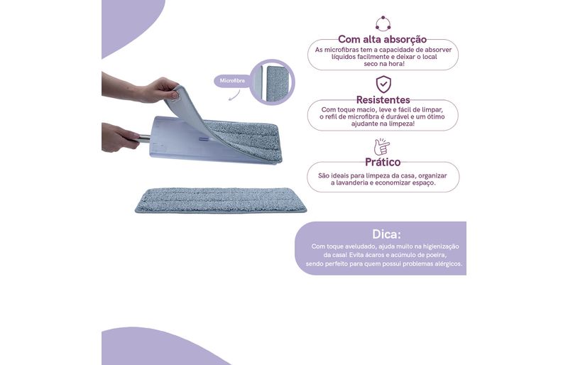 resistente e com alta absorção, é ideal para pisos frios, sintéticos ou madeira. prolonga a vida útil do mop, absorve até 8x o seu peso em água, atrai e retém a poeira, não solta fiapos, além de ser super fácil de trocar!