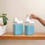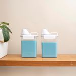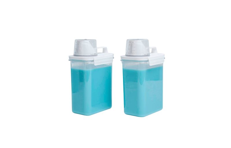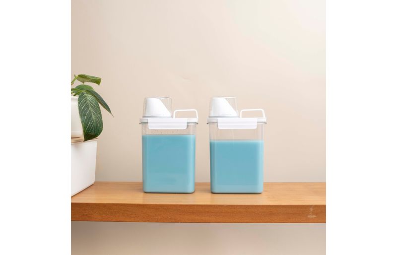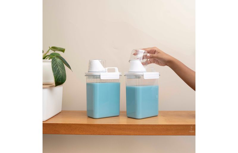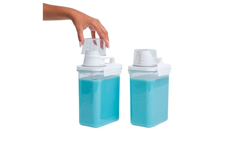 ideais para lavanderia, possuem copo dosador para medir as quantidades exatas, têm alça para facilitar o transporte e travas para evitar vazamentos! armazene sabão em pó, líquido, amaciante, detergente e o que você quiser.