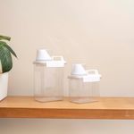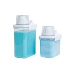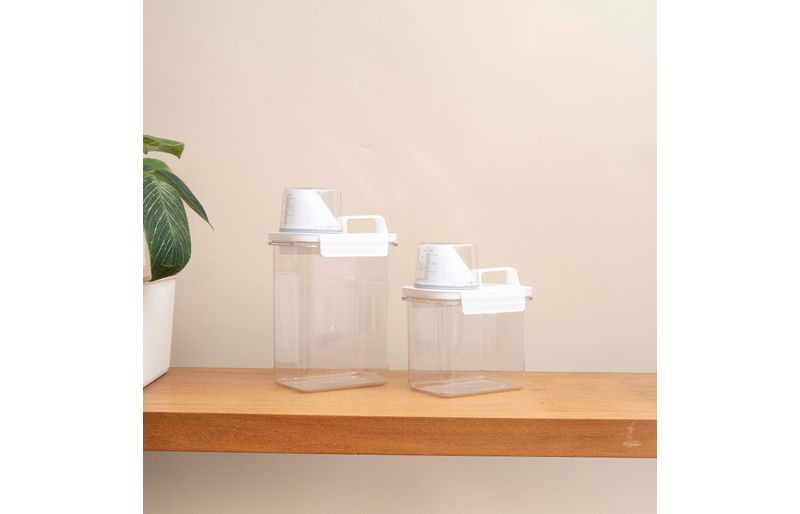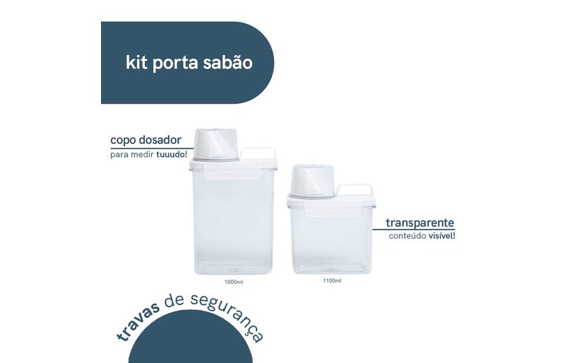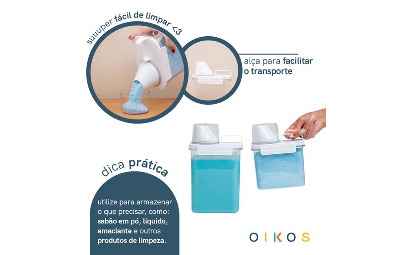 "conheça o kit com 2 porta sabão em pó 1,1l e 1,8l com copo dosador e travas da oikos!