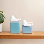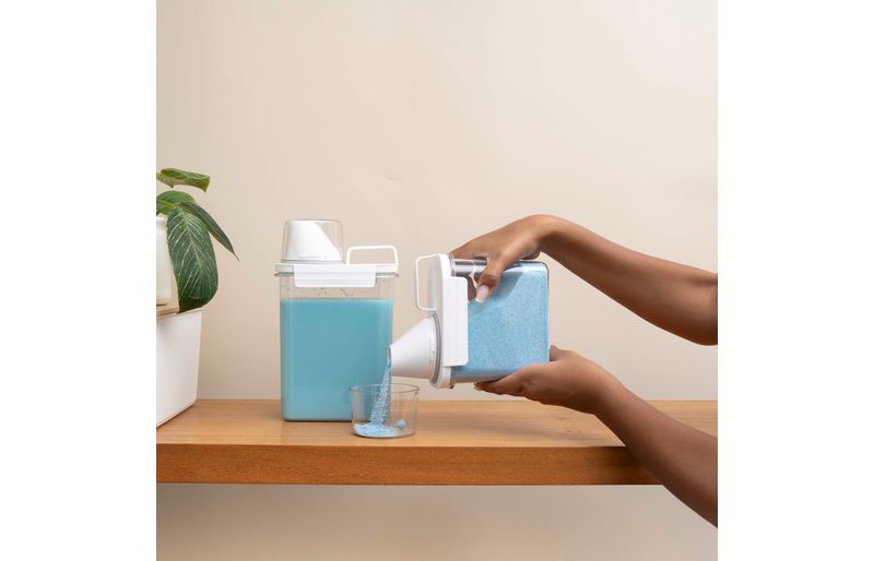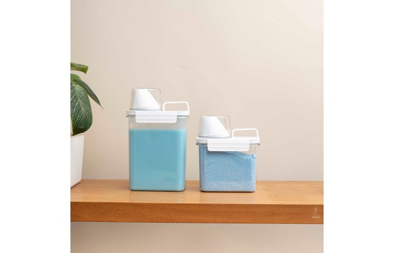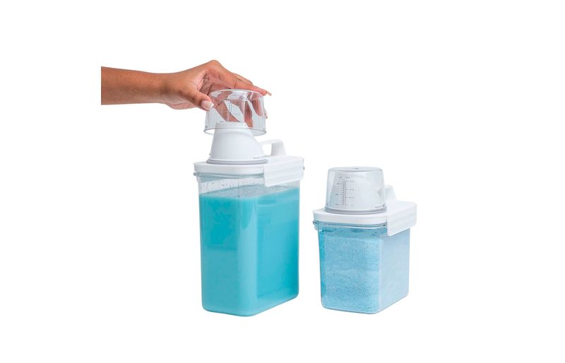 ideais para lavanderia, possuem copo dosador para medir as quantidades exatas, têm alça para facilitar o transporte e travas para evitar vazamentos! armazene sabão em pó, líquido, amaciante, detergente e o que você quiser.