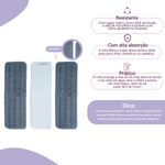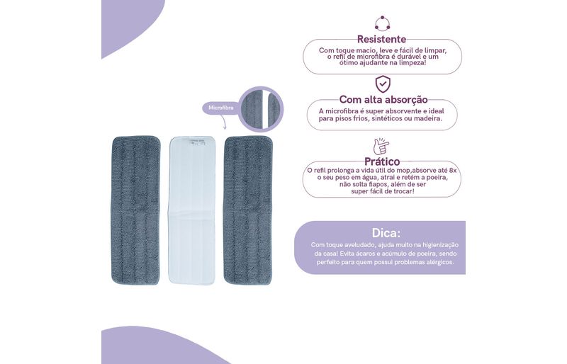 resistente e com alta absorção, é ideal para pisos frios, sintéticos ou madeira. prolonga a vida útil do mop, absorve até 8x o seu peso em água, atrai e retém a poeira, não solta fiapos, além de ser super fácil de trocar!