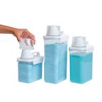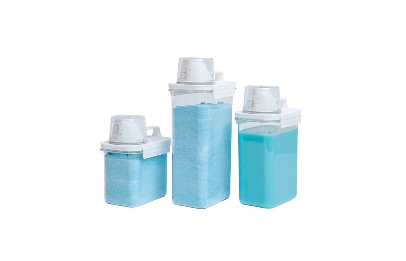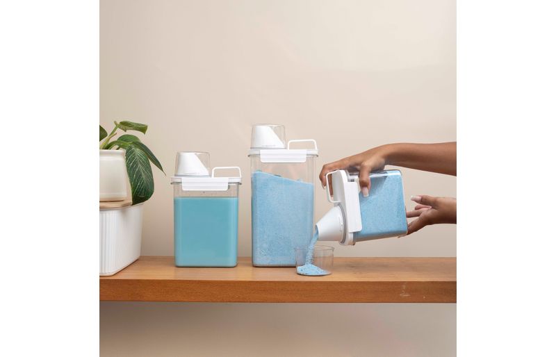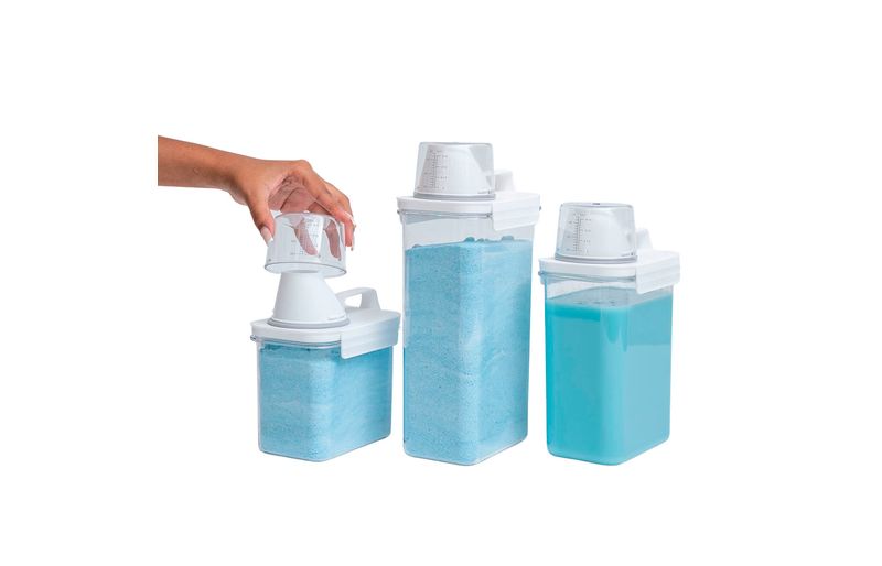 ideais para lavanderia, possuem copo dosador para medir as quantidades exatas, têm alça para facilitar o transporte e travas para evitar vazamentos! armazene sabão em pó, líquido, amaciante, detergente e o que você quiser.