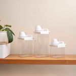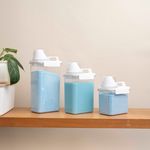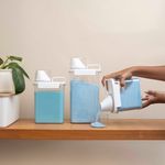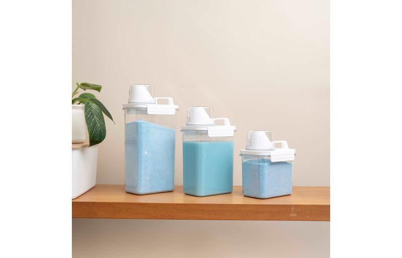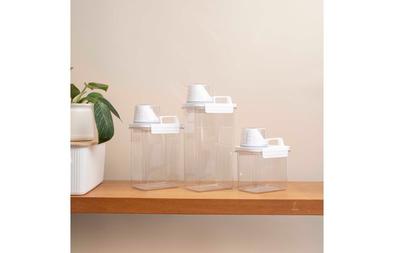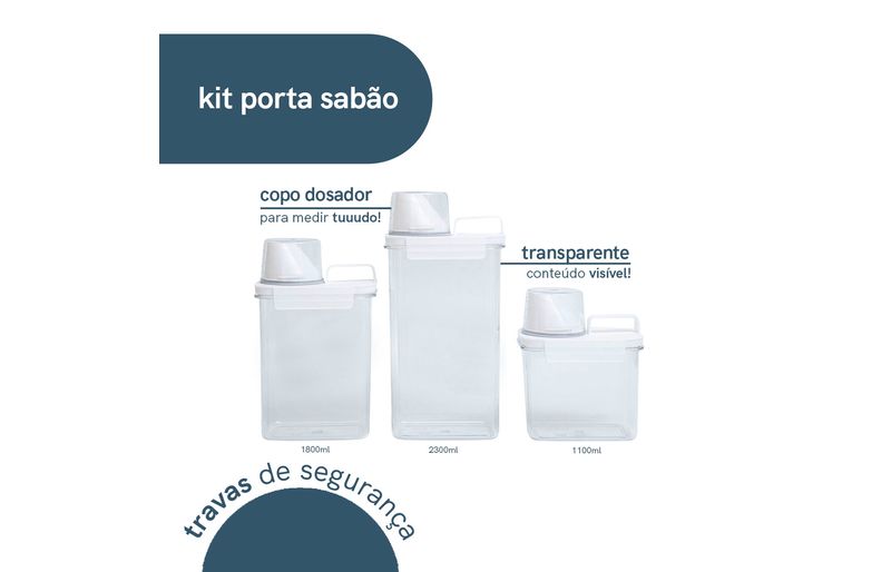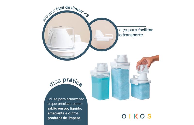 "conheça o kit com 3 porta sabão em pó 1,1l, 1,8l e 2,3l com copo dosador e travas da oikos!