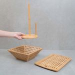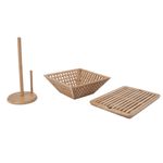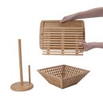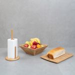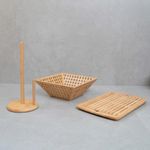 """conheça o kit com fruteira vazada de bambu, porta papel toalha de bambu e tábua migalheira de bambu da oikos.