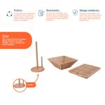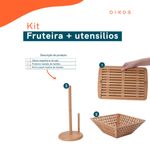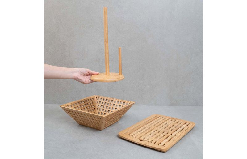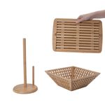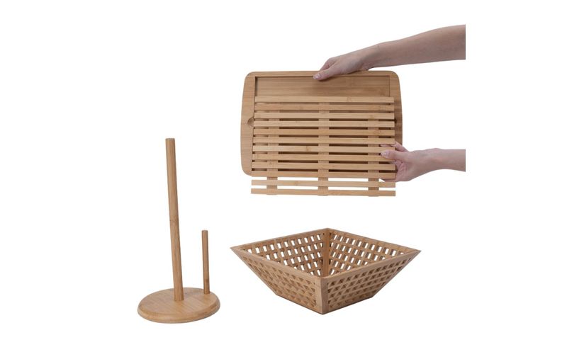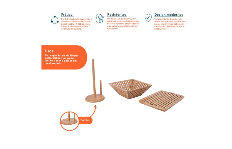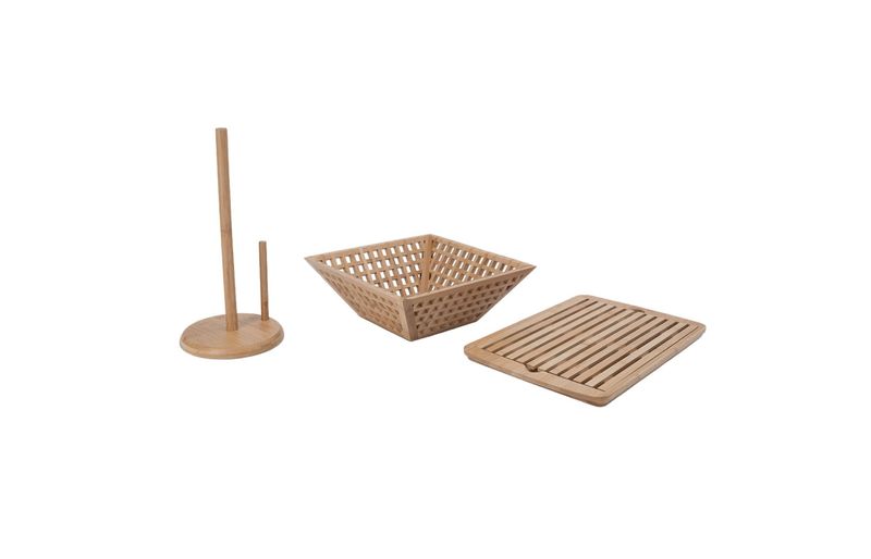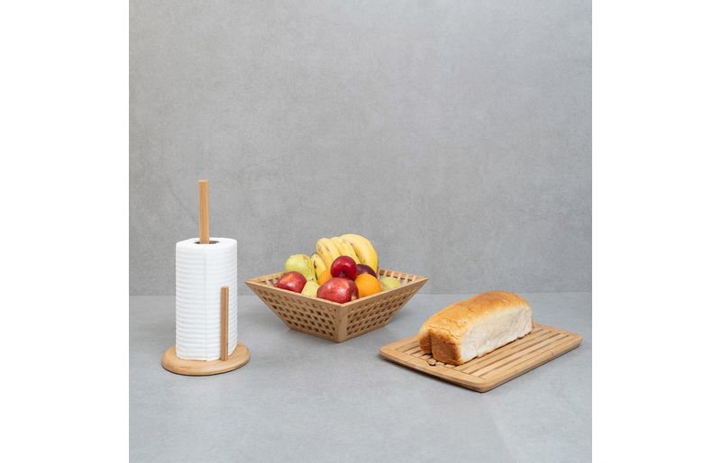 resistente, multiuso e com design moderno, é o kit ideal para organizar e acomodar bem alimentos e seus itens de cozinha. a fruteira vazada, o porta papel toalha e a tábua migalheira de bambu são funcionais e decorativos.
