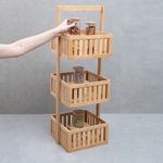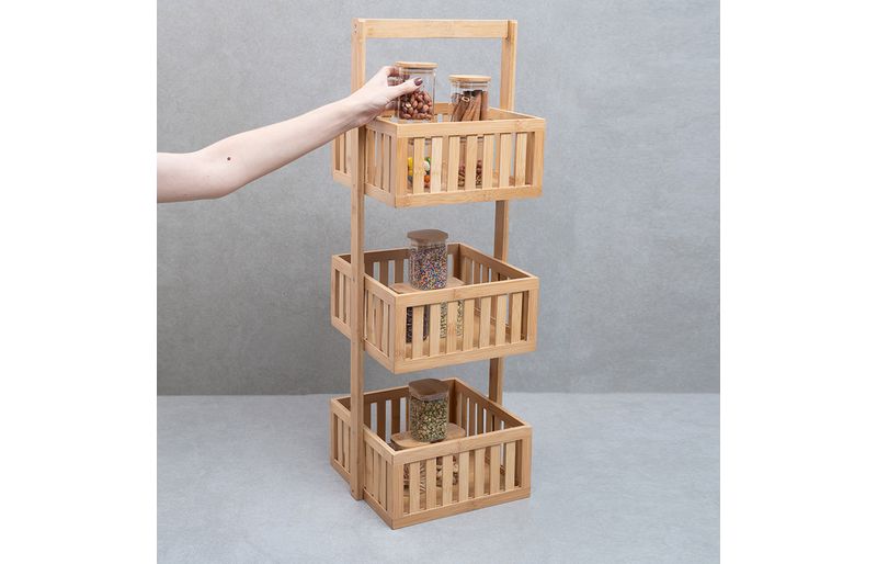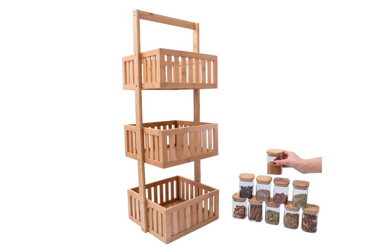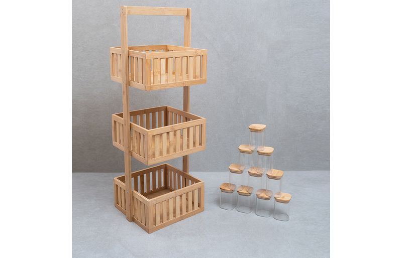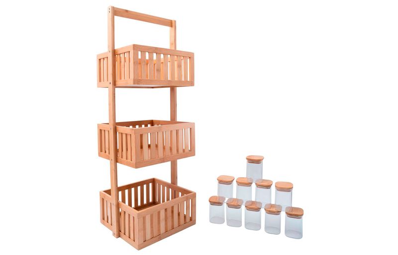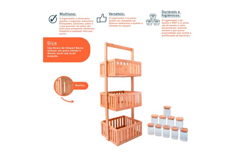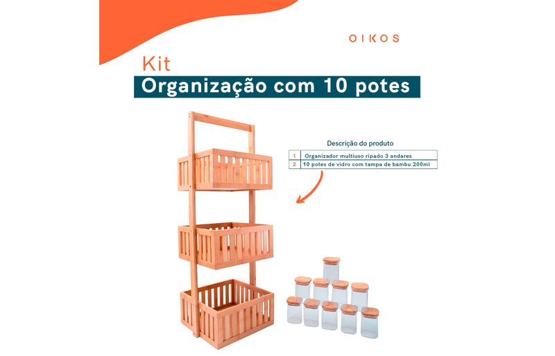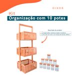 Kit com organizador multiuso ripado 3 andares e 10 potes de vidro com tampa de bambu 200ml- oikos