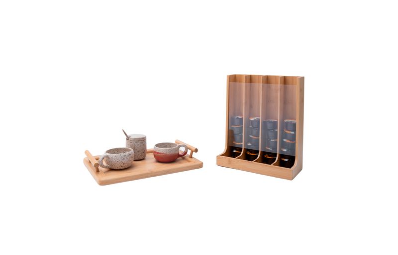 o porta cápsulas é de bambu e acrílico, a bandeja é de bambu. para limpar, basta utilizar um pano úmido, secar em seguida e deixar em local arejado.