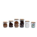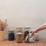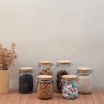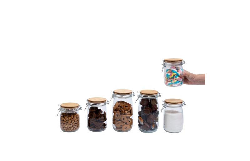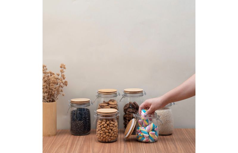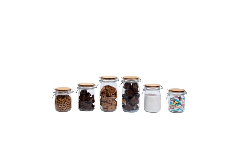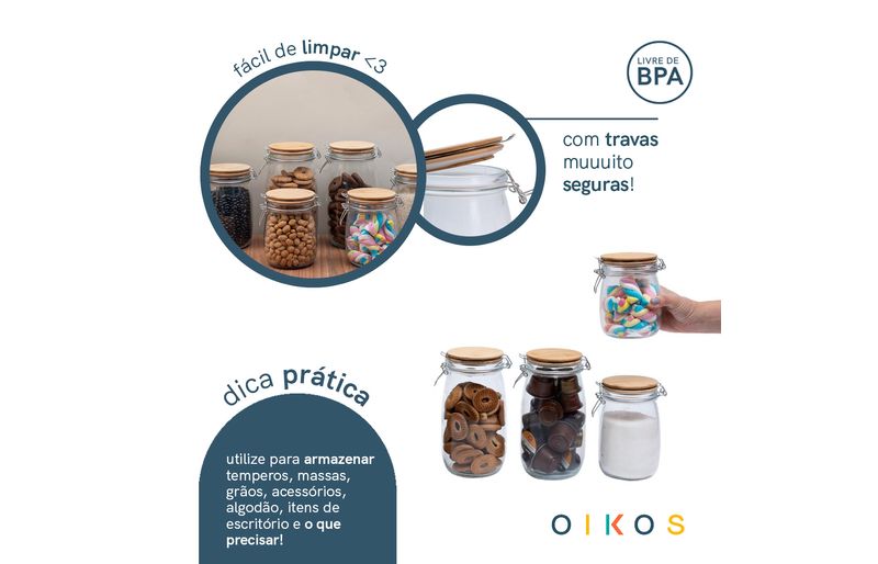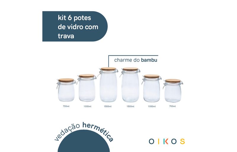 "conheça o kit de 6 potes de vidro com tampa de bambu e trava de 700ml, 1l e 1,5l da oikos.