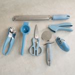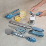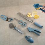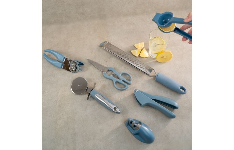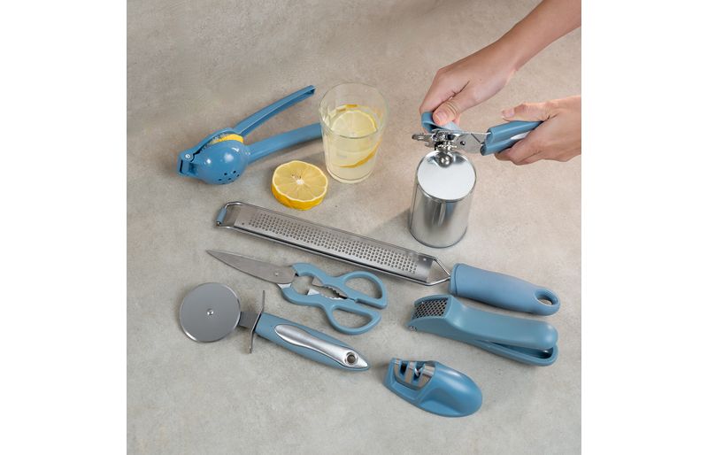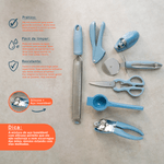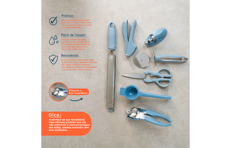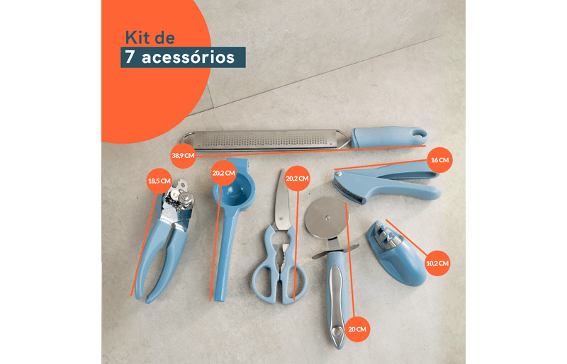 Esse é o kit de 7 acessórios essenciais oikos. esse kit contém : 1 ralador régua fino de inox com cabo - oikos 1 espremedor de alho - oikos 1 abridor de latas multiuso - oikos 1 tesoura culinária multiuso - oikos 1 cortador de pizza - oikos 1 espremedor de limão - oikos 1 afiador de facas – oikos esse é o ralador régua fino e com cabo da oikos - que tem como missão fazer o trabalho duro por você. versátil: peça coringa no preparo de receitas, ele rala legumes, frutas, frios, biscoitos, chocolates, queijos e mais! design prático: seu formato em régua permite ralar diretamente no prato, panela ou tigela - é só apoiar a base de silicone na mesa e segurar pelo cabo, que também é de silicone. durável e resistente: a mistura de aço inoxidável com silicone permite que ele não enferruje e nem escorregue das mãos, mesmo estando com elas molhadas. esse é o espremedor de alho da oikos. chapa articulada e higiênica: basta pressionar a chapa no sentido oposto da saída do alho triturado, assim ela desencaixa sem soltar, mais fácil de limpar. design ergonômico: por ter hastes ergonômicas e longas, esse espremedor encaixa direitinho na palma da mão e mantém seus dedos livres do cheiro forte que o alho pode deixar. esse é o abridor de latas da oikos, aquele parceiro que protege contra acidentes ao abrir latas e garrafas. abre latas: basta encaixar o abridor na beirada, apertar e girar a manivela. sem rebarbas: por abrir latas uniformemente, gera uma borda bem lisa - sem aquelas rebarbas pontudas que machucam, sabe? abre garrafas: é só encaixar na garrafa a ponta que fica ao lado do furo passante, abrir e brindar. ergonômico: seu suporte tem um toque suave que encaixa confortavelmente em qualquer mão. essa é a tesoura culinária e multiuso da oikos. multiuso mesmo: abre garrafas, quebra nozes, corta ossos e cartilagens e ainda descama peixes! resistente e durável: feita de metal e plástico. otimiza bem o espaço: essa tesoura é uma mão na roda para pequenos espaços, já que une diferentes ferramentas em uma só. esse é o cortador de pizza de inox da oikos. prático: um item essencial para quem gosta de cozinhar, tem como missão cortar até as massas mais grossas sem esforço e sem deixar manchas. versátil: com rolagem suave, permite o corte de pizzas, massas e verduras enquanto mantém seguras as pontas dos seus dedos. design ergonômico: seu cabo de silicone garante uma maior firmeza, muito fácil de usar. resistente: feito de inox, esse cortador de pizza é bem durável. esse é o espremedor de limão da oikos e tem como missão trazer praticidade no preparo de suas bebidas! versátil: vai da limonada até a caipirinha, passando pelos alimentos temperados direto na panela ou no prato. prático: suas hastes maciças e longas ajudam a evitar o contato da acidez do limão com a pele - previne queimaduras de limão no sol. durável e resistente: por ser feito de material metálico, tem grande durabilidade e resistência e garante o máximo de suco com o mínimo de esforço para o seu dia a dia! esse é o afiador de facas da oikos. com sua base antiderrapante, garante firmeza da afiação enquanto o aço de tungstênio amola a lâmina, a cerâmica dá o polimento final, dando aquele brilho para suas facas. sua limpeza é externa, não sendo necessário lavar com água nem sabão, mas sim apenas utilizar um pano macio levemente umedecido.
