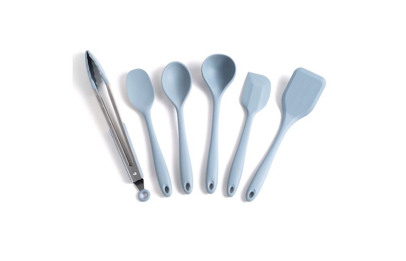 "esse é o kit de utensílios de silicone com 6 peças azul da oikos.