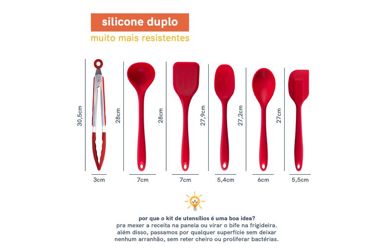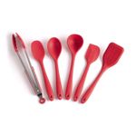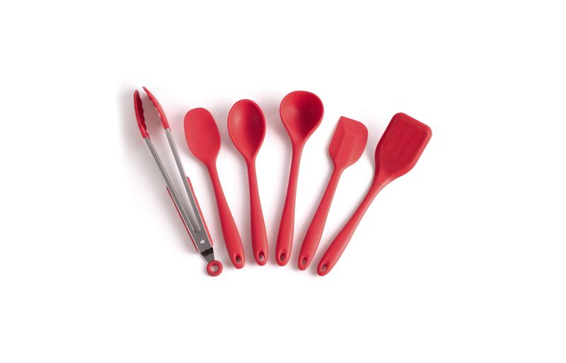 "esse é o kit de utensílios de silicone com 6 peças vermelho da oikos.