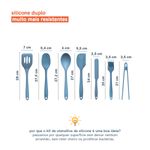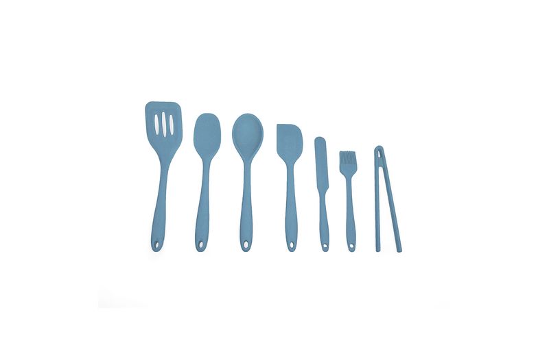 "esse é o kit de utensílios de silicone com 7 peças azul da oikos.