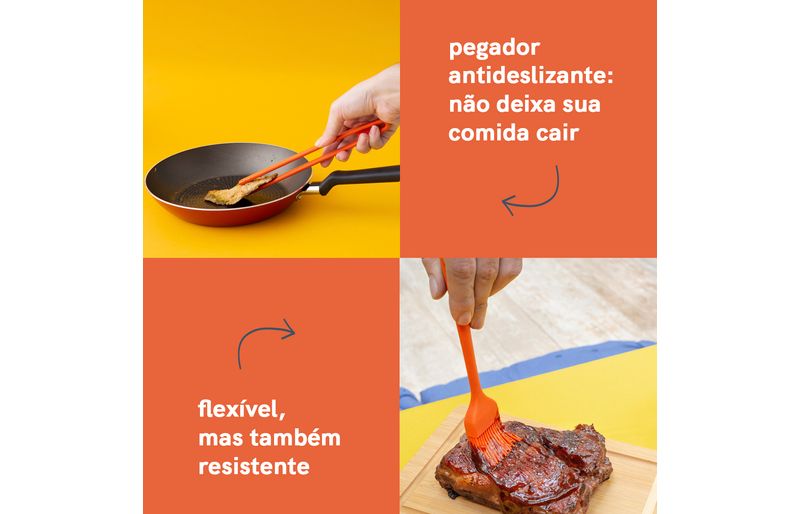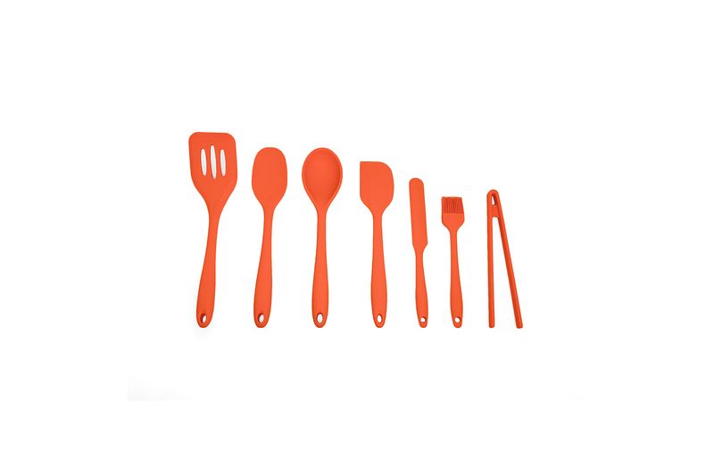 "esse é o kit de utensílios de silicone com 7 peças laranja da oikos.