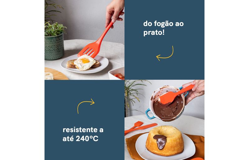 atire a primeira pedra quem nunca arranhou uma panela! por isso gostamos muito de utensílios de silicone para o preparo de alimentos, ele escorrega pela panela toda sem deixar nenhum arranhão! e você ainda pode bater a haste para tirar o excesso que ficou, sem amassar a beirada dela. o silicone também facilita e muito a limpeza, já que sua superfície lisa não retém cheiro, não prolifera bactérias e ainda não conduz o calor provocado pela chama do fogão. a linha de utensílios da oikos te ajuda nas mais diversas aventuras culinárias sem te dar o bolo.