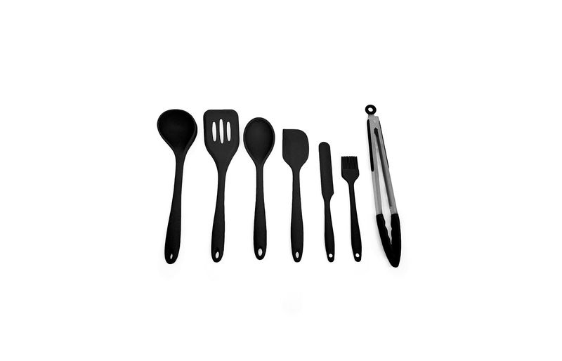 "esse é o kit de utensílios de silicone com 7 peças preto da oikos.