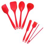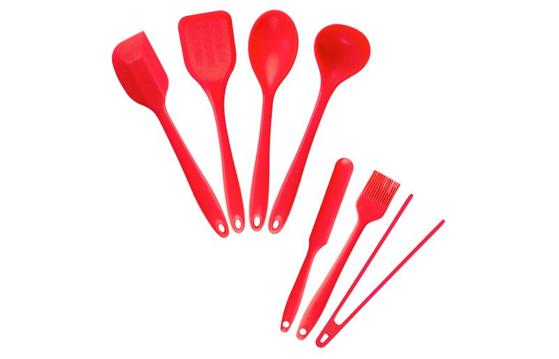 Esse é o kit de utensílios de silicone na cor vermelho da marca oikos composto por 07 peças.
