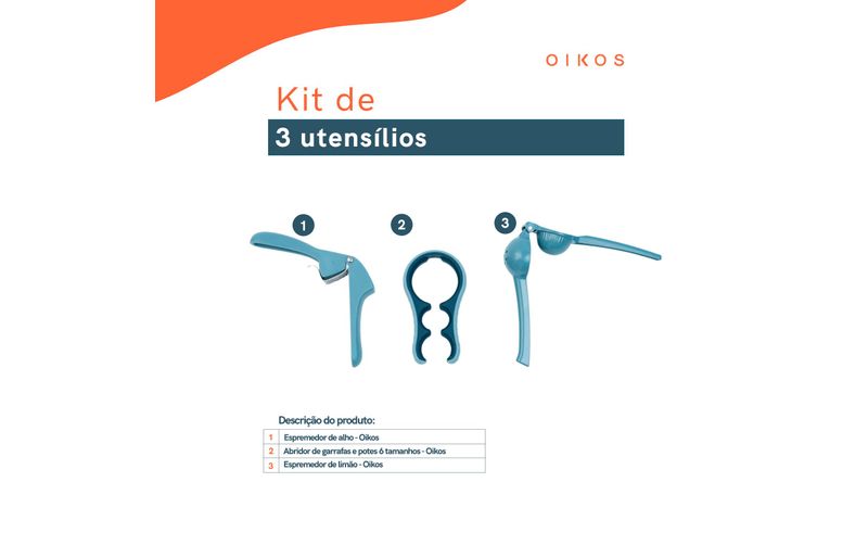 Kit espremedor de alho, espremedor de limão e abridor de garrafas e potes - oikos