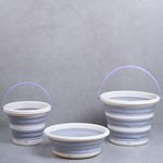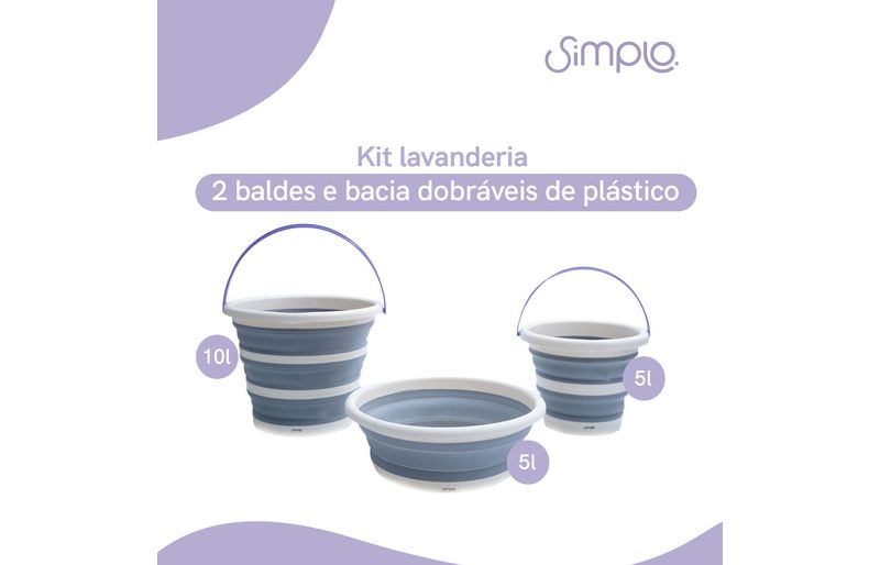 "conheça o kit lavanderia com 2 baldes dobráveis de plástico de 5l e 10l e bacia de 5l da simplo.