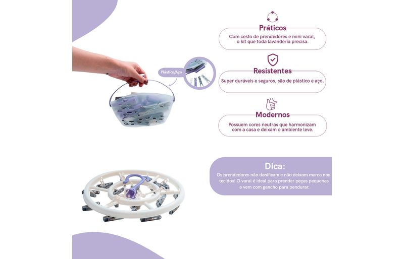 práticos e resistentes, são itens ótimos para organizar a lavanderia, fixar roupas no varal e fechar embalagens. os prendedores não danificam e não deixam marca nos tecidos e possuem alta durabilidade. o varal é ideal para prender peças pequenas e roupas íntimas e vem com gancho para pendurar.