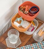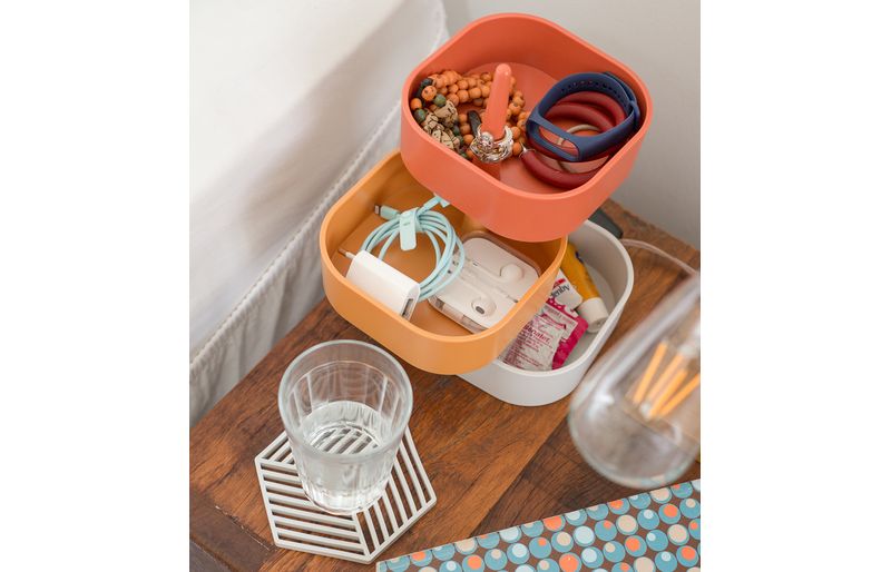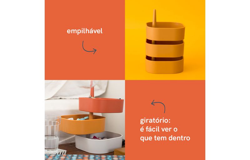 multiuso que só ele, serve petiscos, organiza acessórios e deixa seus pertences sempre à mão. por ser empilhável, organiza tudo na ordem que você quiser - e no lugar também. ao empilhar um no outro, ele gira para ajudar a enxergar o que tem dentro. de quebra, seu suporte também serve de apoio para carregá-lo para outro lugar - ou só guardar seus anéis mesmo.