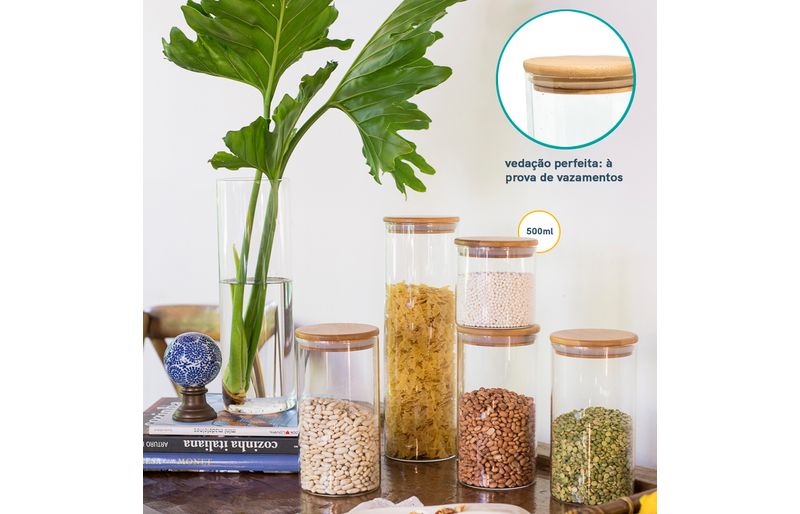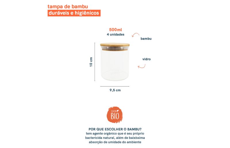 4 unidades - pote de mantimentos de 500 ml com tampa de bambu – oikos