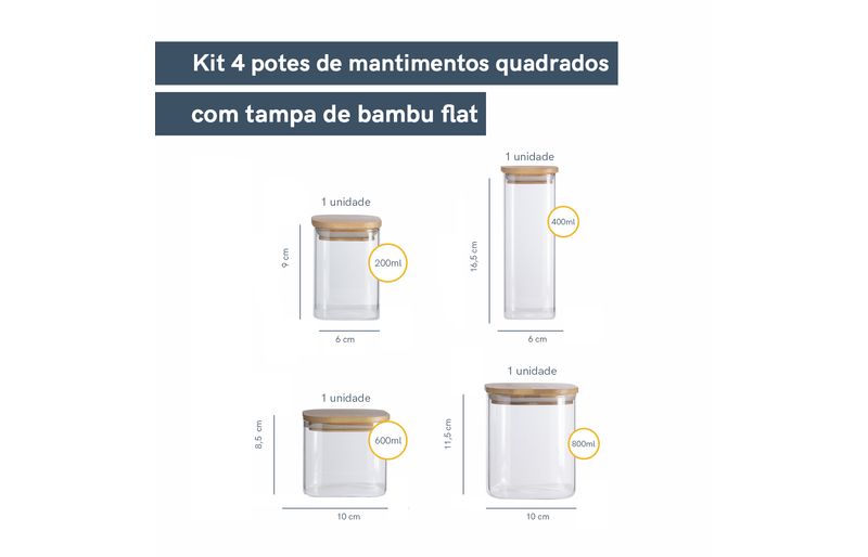 1 unidade - pote de mantimentos quadrado flat 200ml tampa bambu – oikos