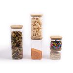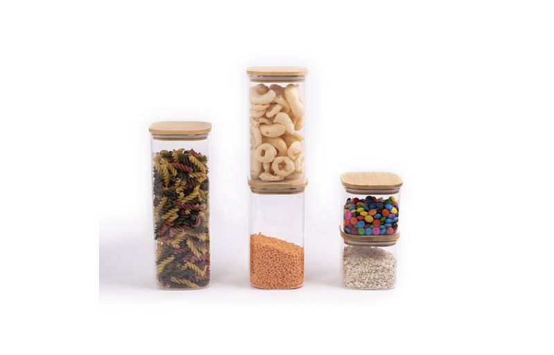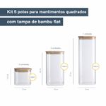 "esse é o conjunto de potes de mantimentos quadrado flat com tampa de bambu da oikos. seu formato quadrado ajuda a aproveitar melhor o espaço - ele encaixa direitinho no canto do armário. tampa flat: uma tampa de bambu retinha, fácil de limpar e que fica uma graça na cozinha ;).