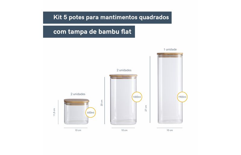 1 unidade - pote de mantimentos quadrado flat 1900ml tampa bambu - oikos