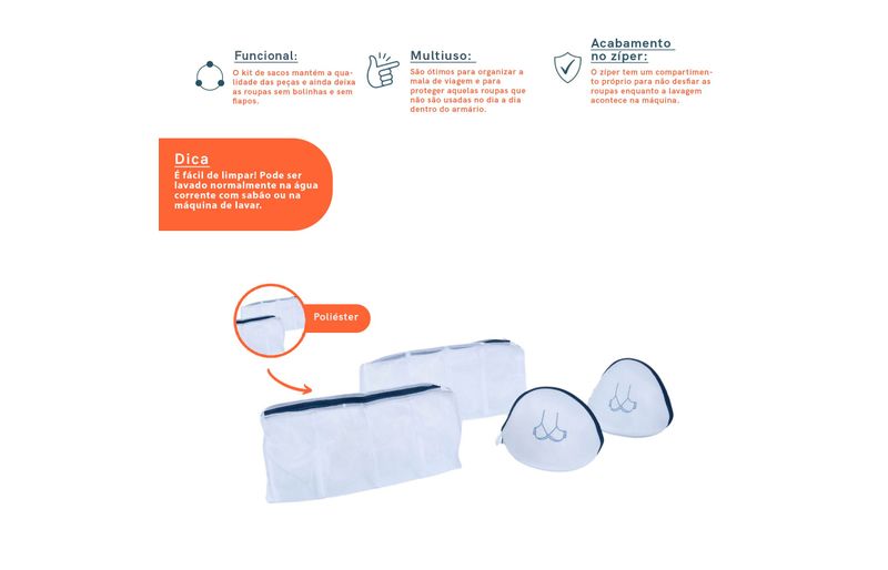 funcionais e multiuso, ajudam na lavagem, mantém a qualidade das peças e ainda deixam o tecido sem bolinhas e sem fiapos! são ótimos até para organizar a mala de viagem e para proteger aquelas roupas que não são usadas no dia a dia dentro do armário. além disso, o zíper tem um compartimento próprio para não desfiar as roupas enquanto a lavagem acontece na máquina.