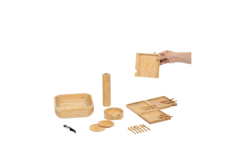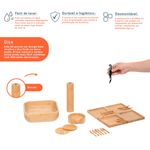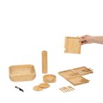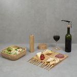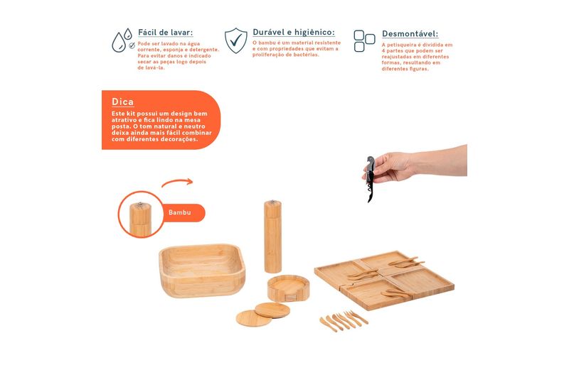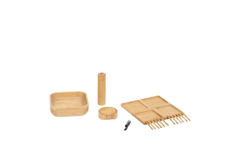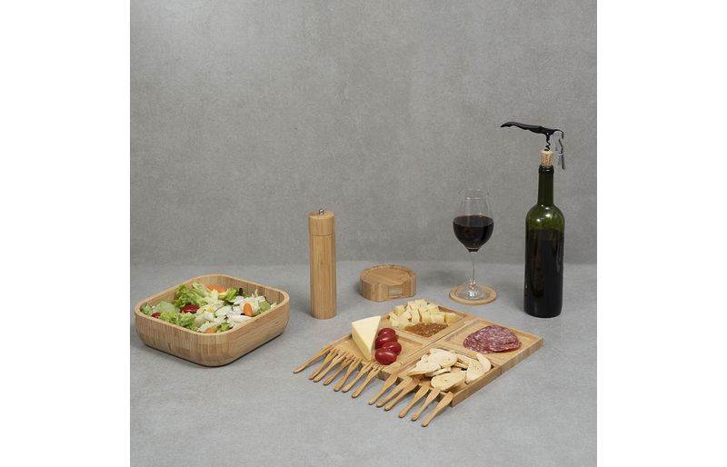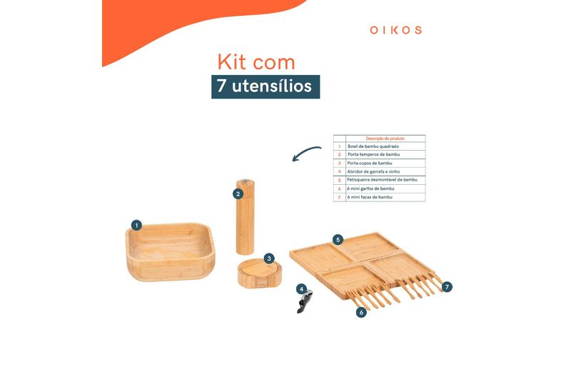 "esse é o kit petisqueira, bowl de bambu, mini garfos, mini facas, porta copos, abridor de vinho e porta temperos 7 pçs – oikos
