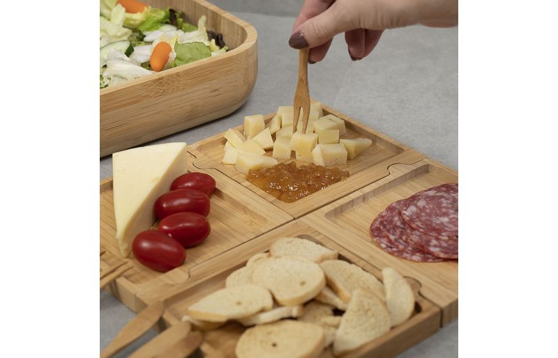 essa é a petisqueira quadrada desmontável de bambu da oikos.