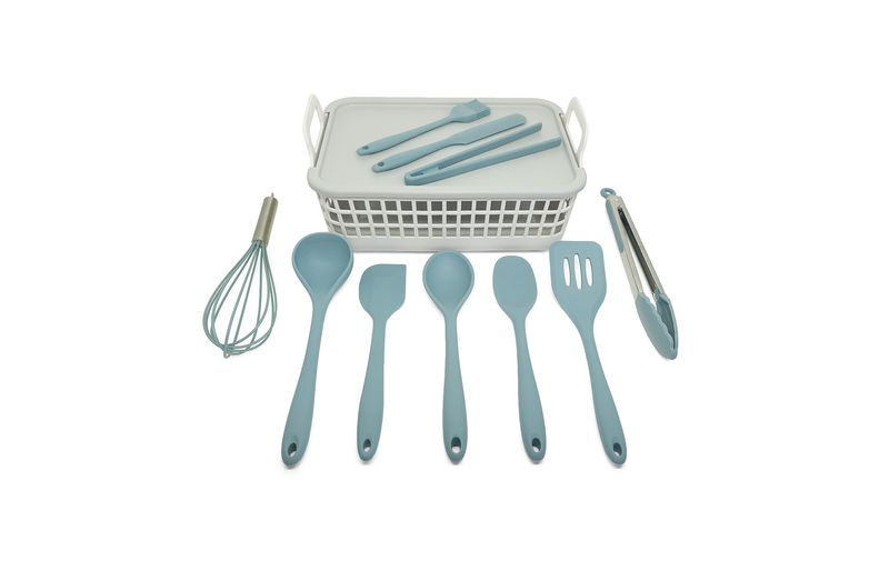 "esse é o kit utensílios de cozinha c/ cesto 11 peças da oikos.