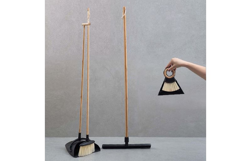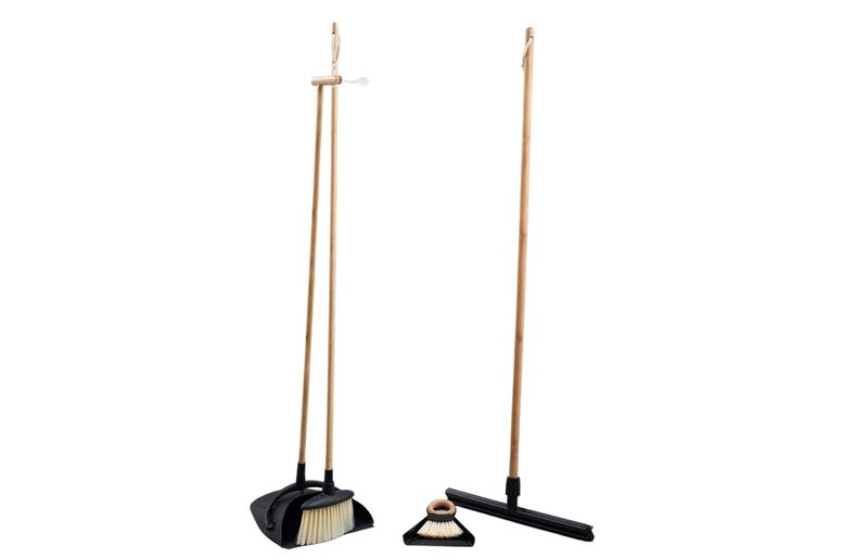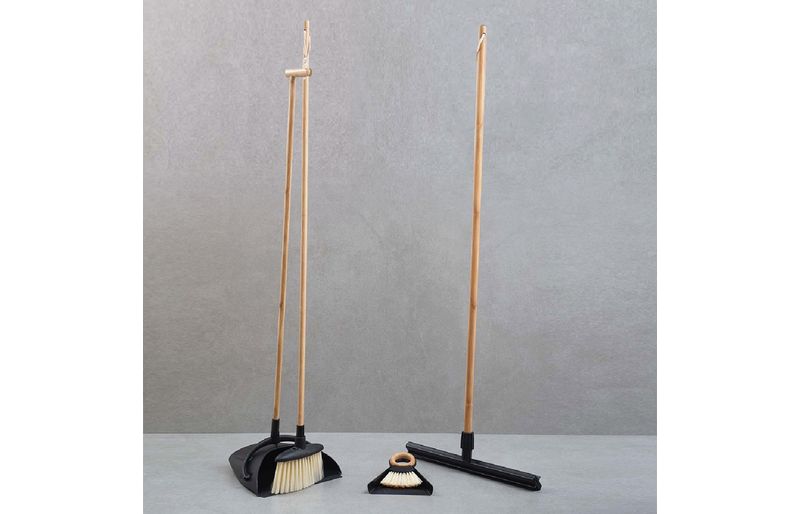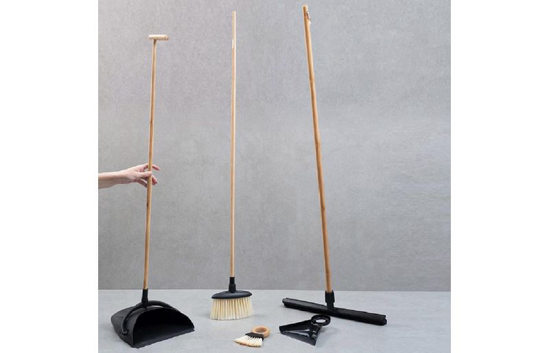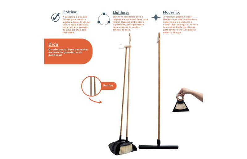 a vassoura e a pá são de bambu, plástico e pet. o rodo e a escova com pá são de bambu, tpr e plástico. para limpar, basta lavar em água corrente com sabão neutro e deixar secar em local arejado.