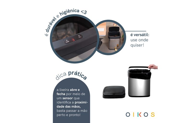 "conheça a lixeira de inox automática 20l retangular da oikos!