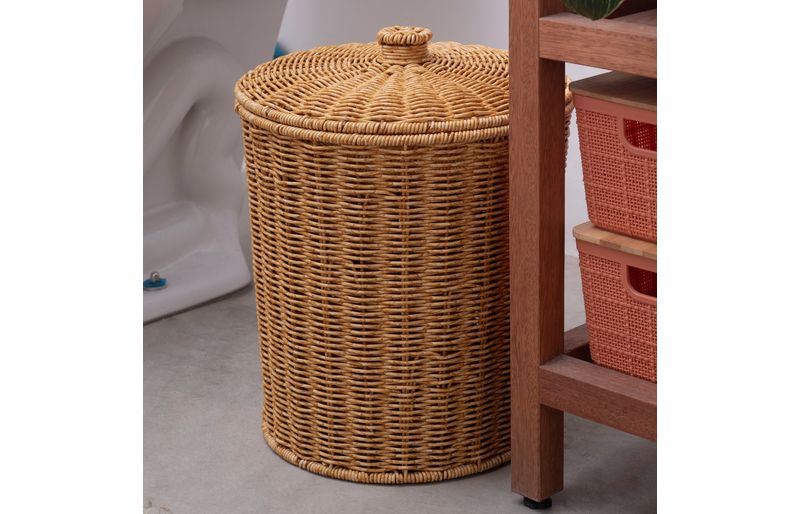 é de plástico com textura que imita rattan: durável, decorativa e fácil de limpar. para limpar, basta lavar com água e sabão neutro em seguida passar suavemente um pano seco. não utilize produtos químicos ou abrasivos na limpeza.