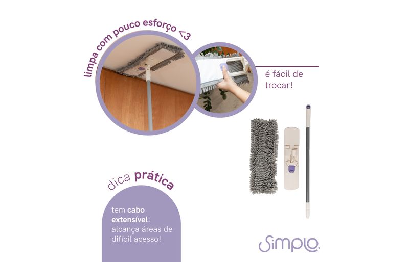 prático, resistente e moderno, tem microfibra de alta absorção: a microfibra chenille possui fios macios e resistentes que limpam e removem a sujeira com facilidade! tem cabo extensível e rotação de 360°: permite alcançar áreas de difícil acesso, como janelas e embaixo de móveis.