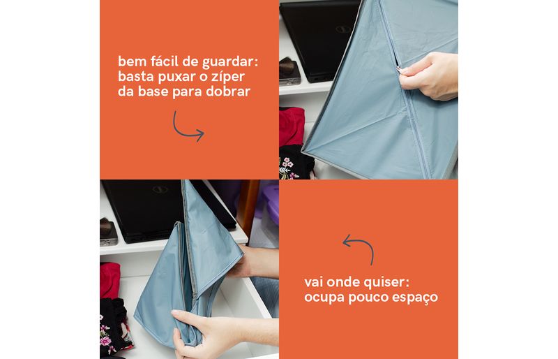 bem fácil de guardar, basta puxar o zíper da base para dobrar e levar para onde quiser.