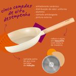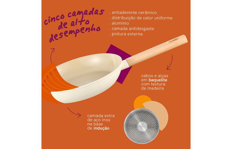 a panela tem 4mm de espessura na borda e 2,8mm no corpo: distribui melhor o calor e evita que os alimentos queimem. possui 5 camadas: antiaderente cerâmico, camada antidesgaste interna, alumínio, camada antidesgaste externa e pintura externa. também tem uma camada extra de aço inox na base de indução!