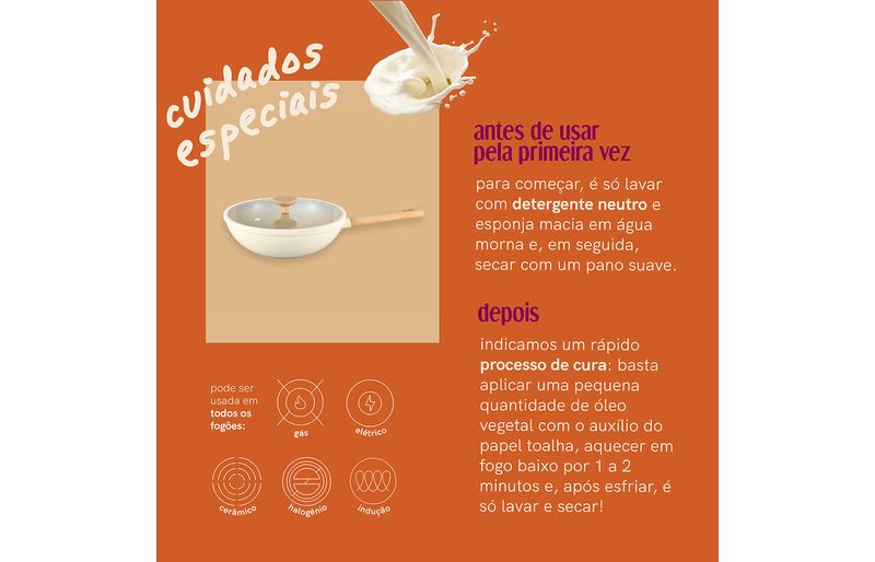processo de cura indicado: basta aplicar uma pequena quantidade de óleo vegetal com o auxílio do papel toalha, aquecer em fogo baixo por 1 a 2 minutos e, após esfriar, é só lavar e secar!