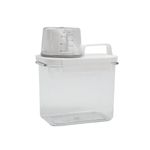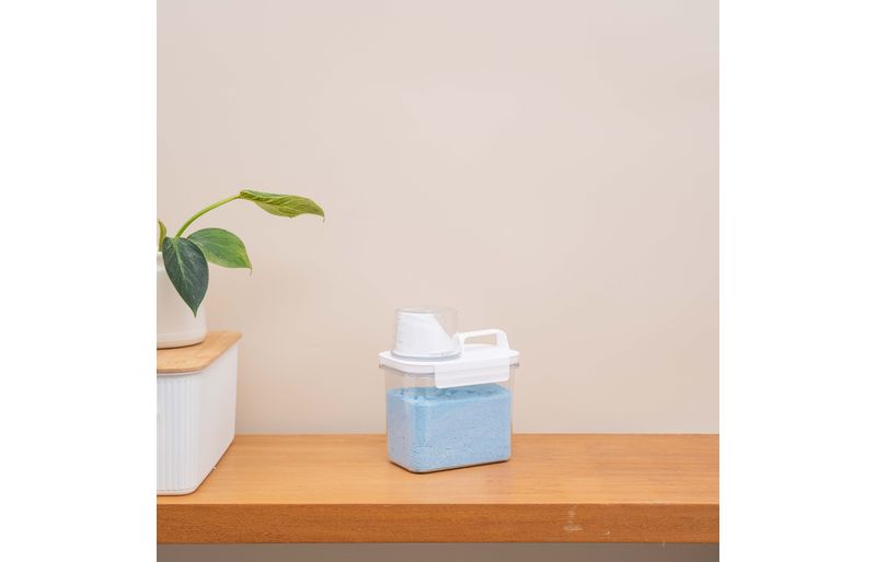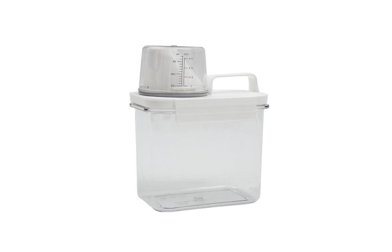 ideal para lavanderia, possui copo dosador para medir as quantidades exatas, tem alça para facilitar o transporte e travas para evitar vazamentos! armazene sabão em pó, líquido, amaciante, detergente e o que você quiser.