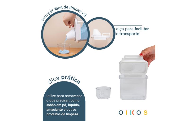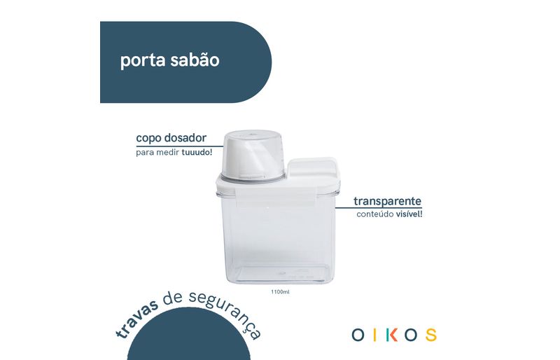 "conheça o porta sabão em pó com copo dosador e trava 1,1l da oikos!