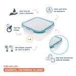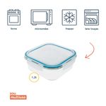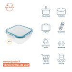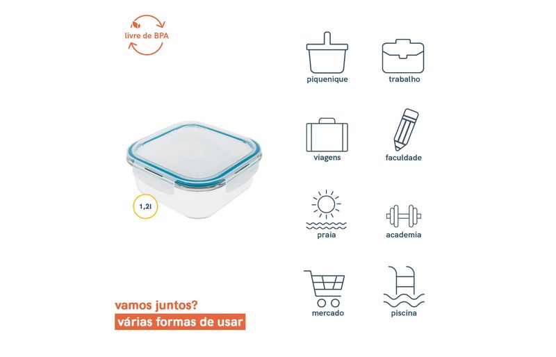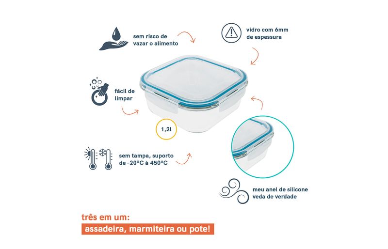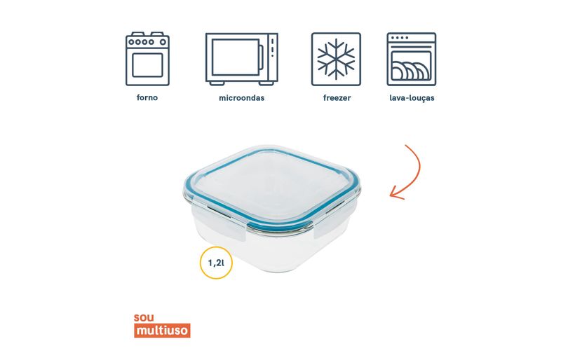 Esse é o pote hermético de vidro quadrado de 1,2l da oikos. por que eu sou o pote da sua vida? - ele pergunta e a gente responde: ele é feito de vidro borossilicato, um vidro bem resistente inclusive ao choque térmico. é por isso que ele pode ir do forno ao freezer, da mesa para a lava-louças. ele é bem bacana no quesito conservação de alimentos, já que combina a força das 4 travas e com o anel de silicone que veda de verdade. assim, dá para você levar ele para cima e para baixo com você - e sem vazar absolutamente nada!