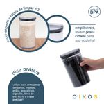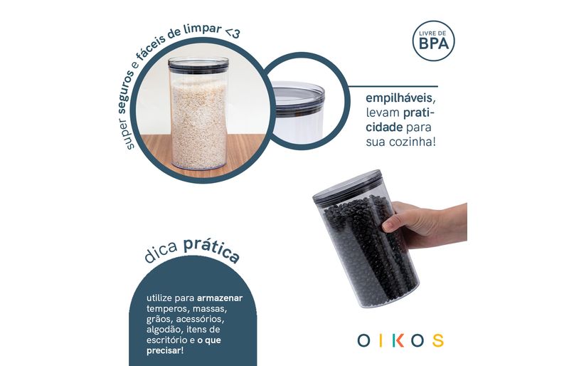 ele é empilhável, durável, possui design moderno e é super versátil! perfeito para armazenar alimentos, temperos, algodão, itens de escritório e o que precisar! além disso, é mestre na conservação: o anel de silicone na tampa garante uma vedação total do pote, conservando os alimentos por muito mais tempo.