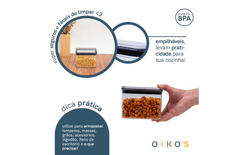 Conheça o pote de acrílico 800ml com tampa transparente quadrado empilhável da oikos!