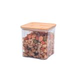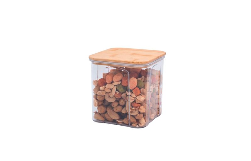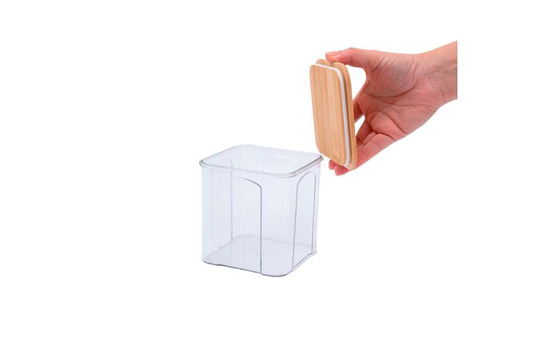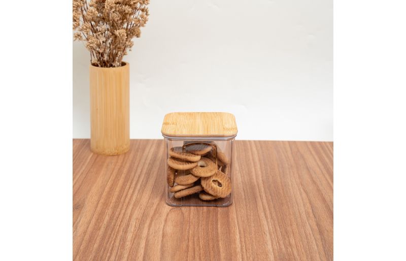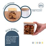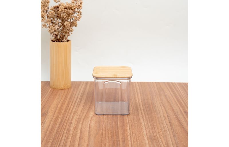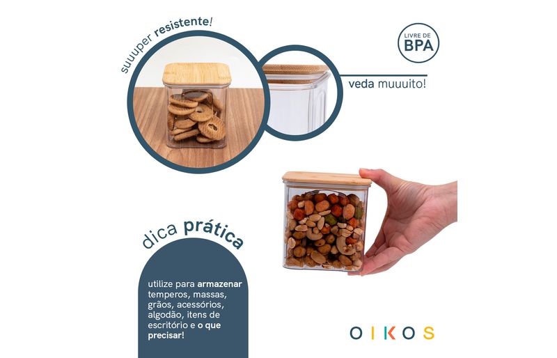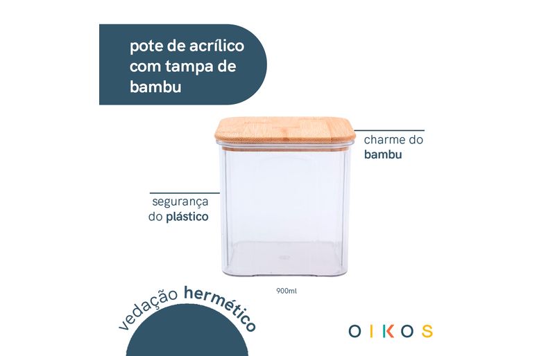 Conheça o pote de acrílico 900ml com tampa de bambu transparente quadrado da oikos!
