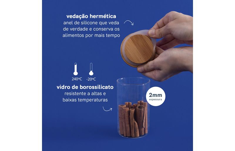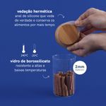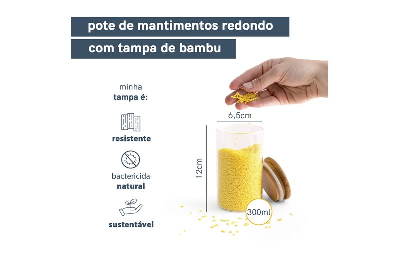 Esse é o pote de vidro hermético redondo de 300ml para mantimentos com tampa de bambu da oikos. não julgue pelas aparências, ele não é só um potinho bonito: com a combinação da vedação de silicone e o bambu antibactericida, esse pote se torna um verdadeiro mestre na conservação de alimentos! e não é só de comida que vive esse pote: além de temperos, sal e açúcar, nele cabe sementes, joias, curativos, grampos, elásticos e outras pequenices que você quiser guardar - isso que é versatilidade.
