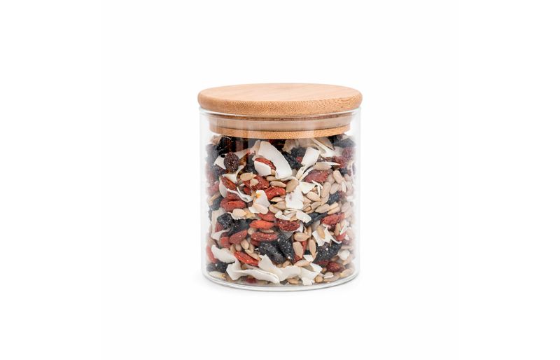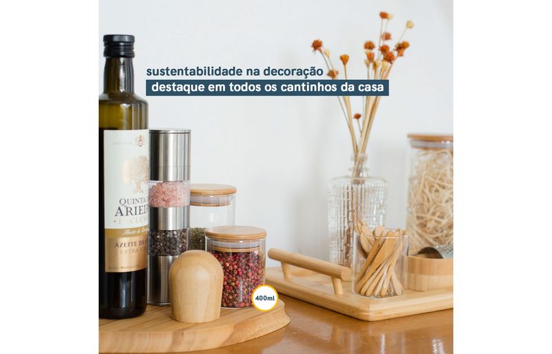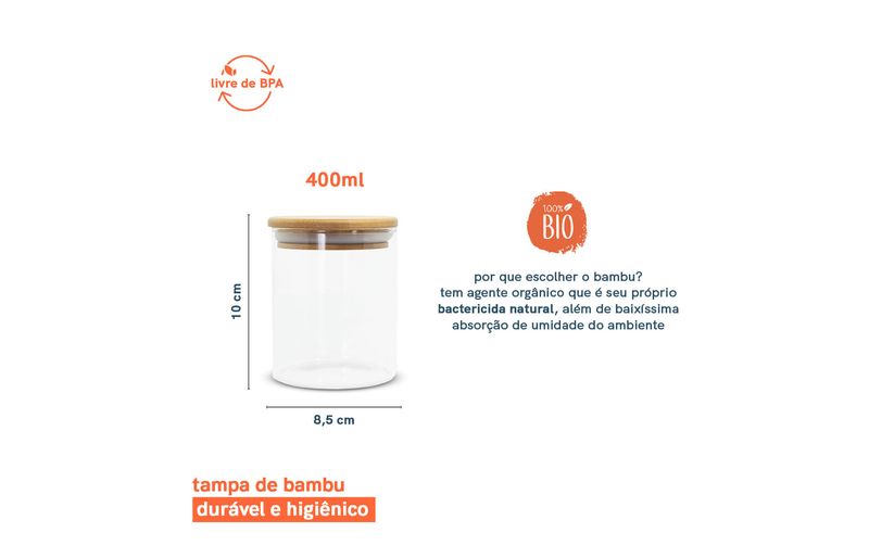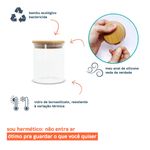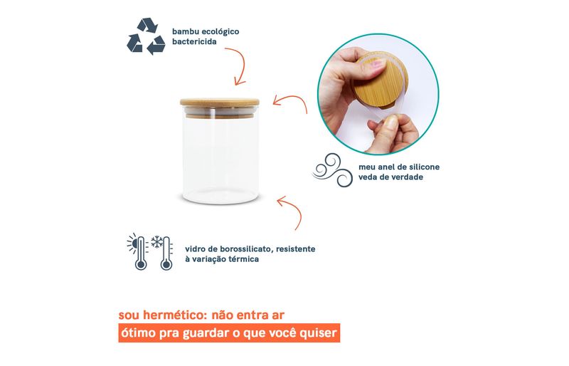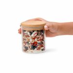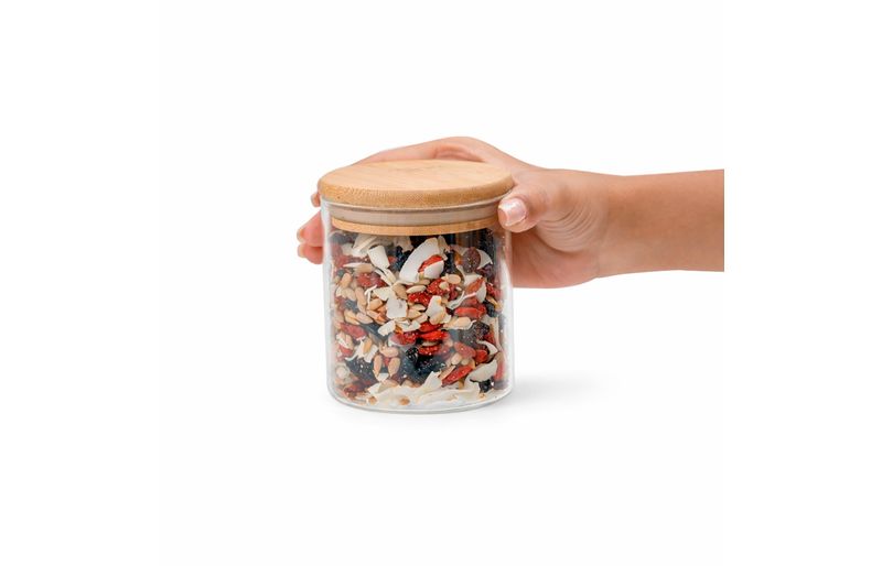 Esse é o pote de vidro hermético redondo de 400ml para mantimentos com tampa de bambu da oikos. não julgue pelas aparências, ele não é só um potinho bonito: com a combinação da vedação de silicone e o bambu antibactericida, esse pote se torna um verdadeiro mestre na conservação de alimentos! e não é só de comida que vive esse pote: moedas, fios, chaves, botões, chocolates, chicletes, peças de quebra-cabeça, bola de gude, itens de costura e o que mais você quiser guardar - isso que é versatilidade.
