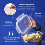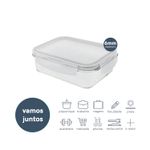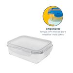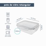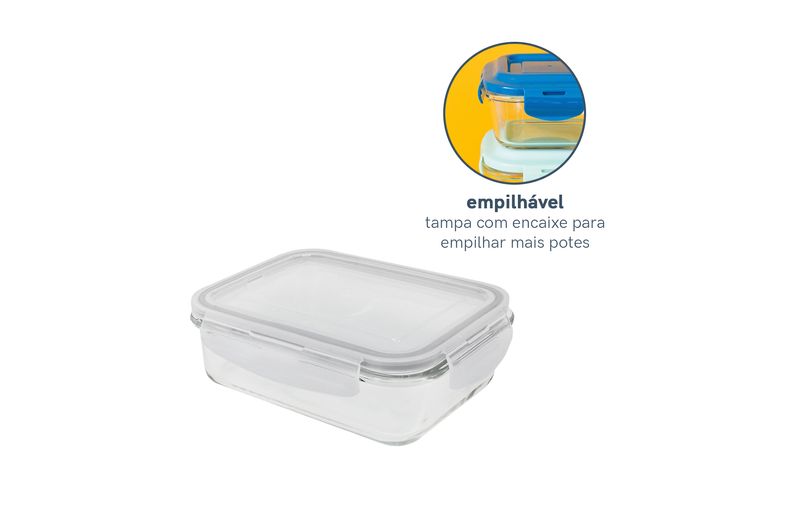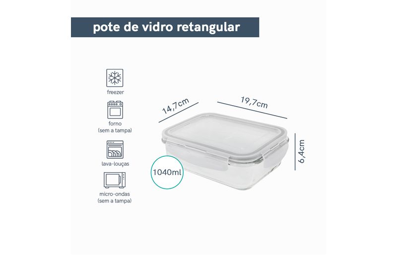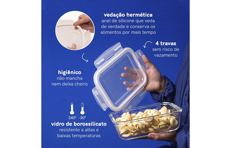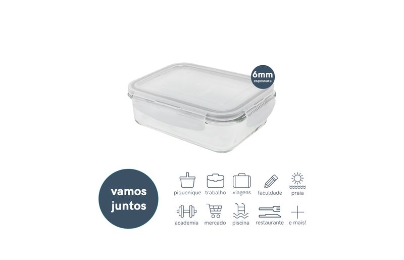 Esse é o pote hermético de vidro retangular de 1040ml da oikos. por que eu sou o pote da sua vida? - ele pergunta e a gente responde: ele é feito de vidro borossilicato, um vidro bem resistente inclusive ao choque térmico. é por isso que ele pode ir do forno ao freezer, da mesa para a lava-louças. e isso faz com que ele tenha três usos diferentes: 1_ como assadeira que vai direto no forno durante o preparo, 2_como marmiteira para sua semana fora de casa e 3_como pote de armazenamento em casa, conservando seus alimentos por mais tempo na geladeira. ele é bem bacana no quesito conservação de alimentos, já que combina a força das 4 travas e com o anel de silicone que veda de verdade. assim, dá para você levar ele para cima e para baixo com você - e sem vazar absolutamente nada!